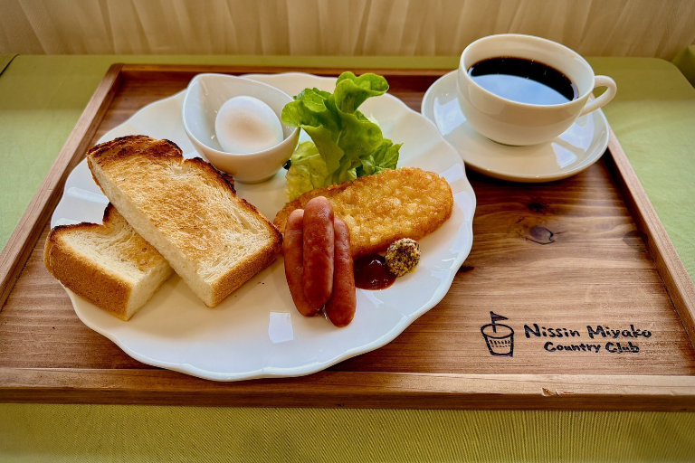 (トースト・サラダ・ゆで卵・ソーセージ・ハッシュドポテト・コーヒー)